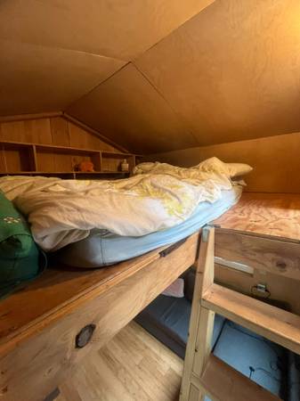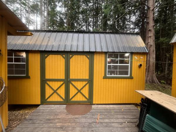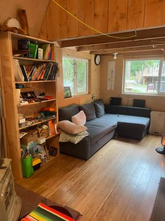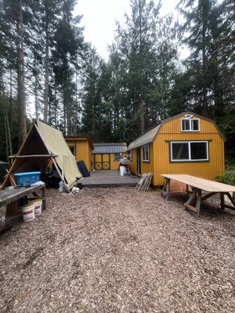 A tiny-home-style living space made up of thoughtfully converted buildings joined by a spacious deck, close to Port Townsend. Kitchen, bathroom, and loft in one building. Living room with woodstove, bedroom, and two lofts in the other building. Kitchen has full size fridge, dishwasher, washer, dryer, and stove with oven. Bathtub, shower, composting toilet in bathroom. Large deck and A-frame canvas tent for additional outdoor living. Quiet, wooded 5-acre lot.