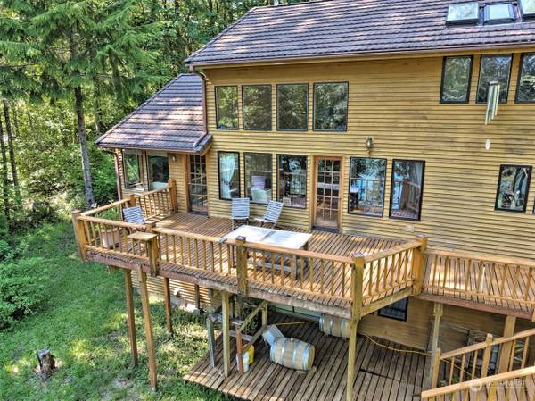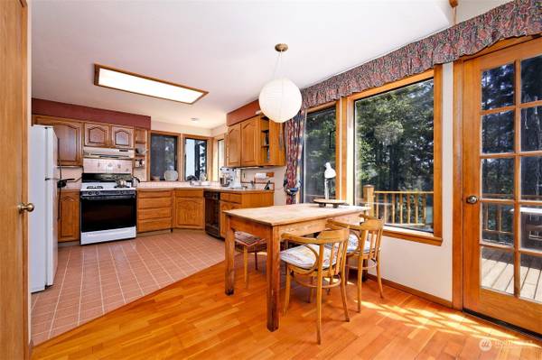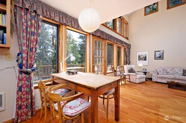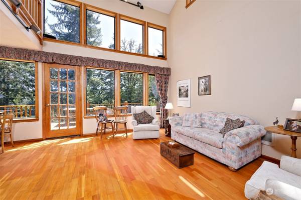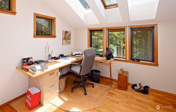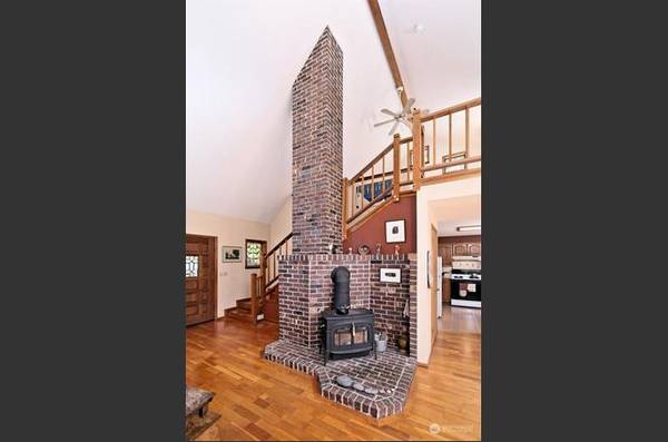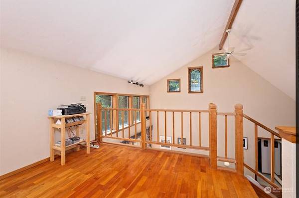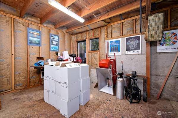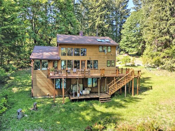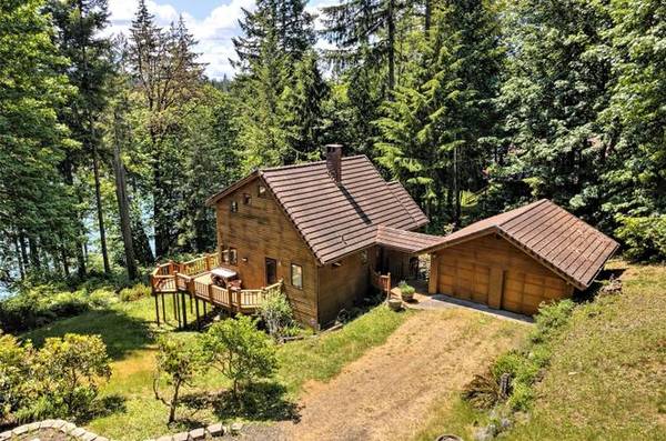 The home features a large Primary bedroom on the main floor with a walk-in closet. Upstairs is an open loft room with another really wonderful view of the water that would make a great office space. Downstairs is a surprisingly cool workshop! The main floor and the downstairs area both have efficient wood stoves to keep everything nice and cozy. There is a detached 2-car garage. There is also access to the beach at the end of the road.
