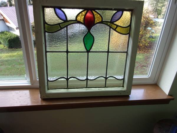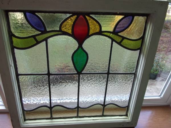 Vintage stain glass window 22" X 22 1/2" Has a small crack in green, Please look at all pictures. Is loose in wood frame.