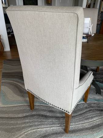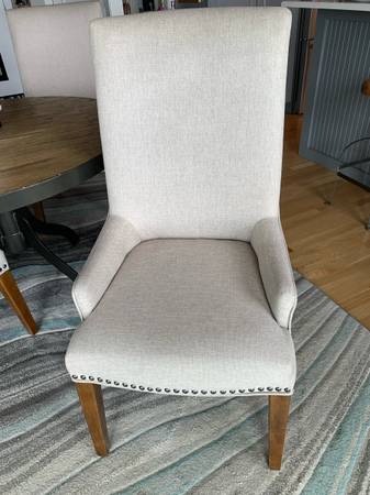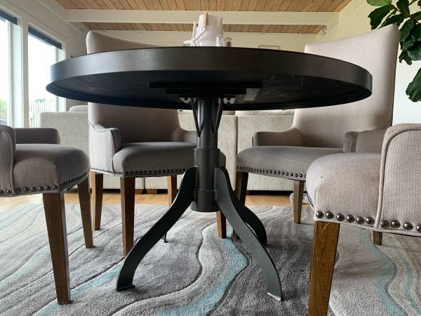 Table; one (1) 48” round dining room table with metal base, 2 1/4” metal edge, decorative stained plywood top. Chairs; four (4) fabric wrapped, wood base, high back chairs