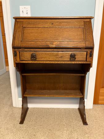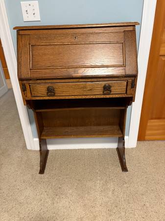 Small antique desk/secretary. Front folds down for desk table. Similar dresser in separate listing.