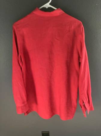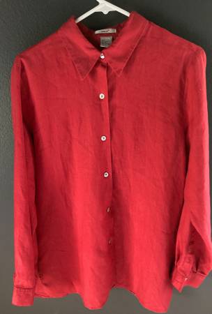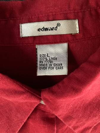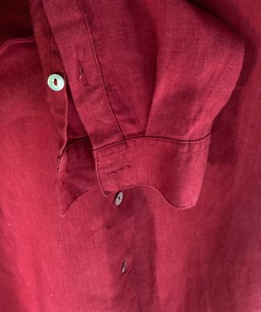 Cheery red shirt with genuine shell buttons. Excellent quality linen. Hand-washed in Free and Clear non-allergenic soap. Wonderful for winter holidays, and comfortable all year round. Side slits are 5½".