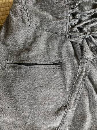 Brand new. Made in Nepal of beautiful handwoven black and white fabric. Attractive corset style front tie makes this adjustable, and the back is elasticized. There is a nice size flat zippered pocket at the right side. So wearable for every day or meditation, etc. All measurements are in the photos.
