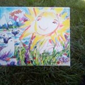 All hand painted in vivid acrylic bright colored paints on an 8 inch by 10 inch stretched canvas over wooden bars. This is an