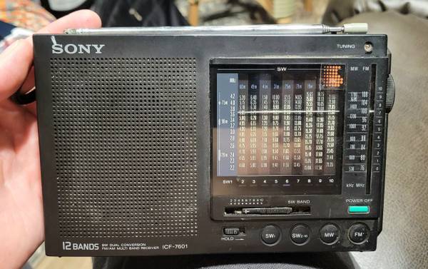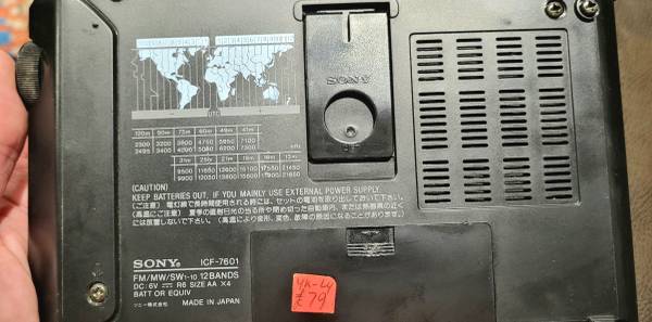 This is a Sony ICF‑7601 portable radio receiver, made in Japan. It covers FM (76–108 MHz), MW (530–1705 kHz), and ten shortwave bands (approx. 2.2–21.95 MHz). In perfect working condition