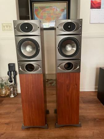 They feature an outrigger style base with sturdy spikes to keep everything nice and stable. The V-10's are a two-way ported design featuring a 7" Vapor Deposited Titanium (VDT) woofer and a 1” soft dome tweeter.