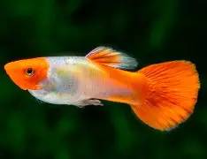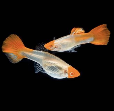 This listing is for 3 live guppies. One male and 2 females. Each fish will vary slightly due to individuality. There are 1 male with an orange 'cap', 1 female with an orange 'cap' and 1 female with no cap. All have orange tails.