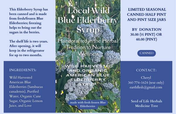 My name is Cheryl, and I make Local Wild American Blue Elderberry Syrup from fresh, frozen, wild elderberries that I gather myself. The syrup is organic, wild-crafted, and made simply with fresh (frozen) wild blue elderberries, purified water, organic cane sugar, and organic lemon juice.