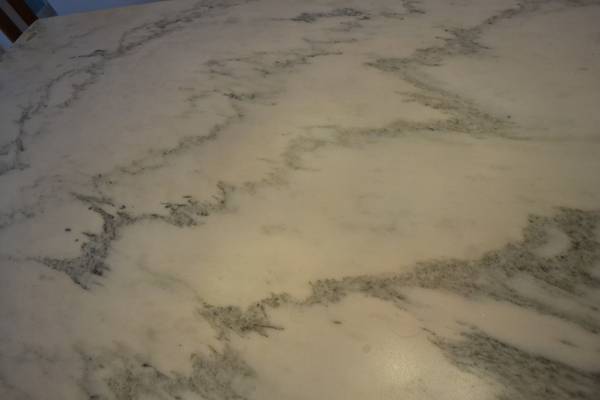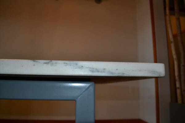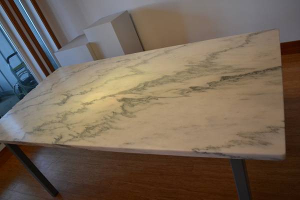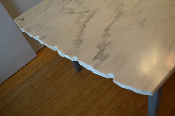 Custom Carrera marble table on powder coated steel base. 3 sides are square while one side has natural edge from quarry. Measurements 41x81x1.25”. Table is super heavy, will need 3 or 4 people to...