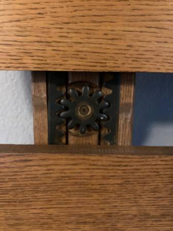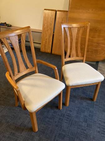 Solid Oak dining room table with 8 chairs, (2 captains) in very nice condition. Table is 6 ft. long and 3 1/2 ft. wide plus it has two 1 ft. wide leaves with gear drive. Very heavy. $300.00 cash...