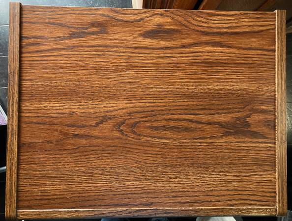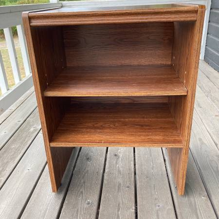 Sturdy oak-grain laminate stand in very good condition, ideal for a printer and/or small items. Included is a 3-position removable shelf, a stationary shelf below, and open space beneath. A 2" opening at the top of the back panel allows cords or other items to reach through the stand’s back. The four glides on the bottom are adjustable.