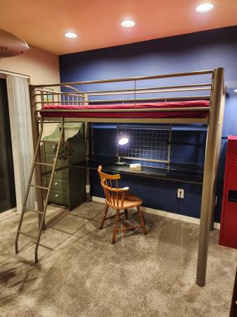 Metal twin bed HEAVY duty steel frame accessible by ladder. Includes memory foam mattress, certipur-us certified for safety.
