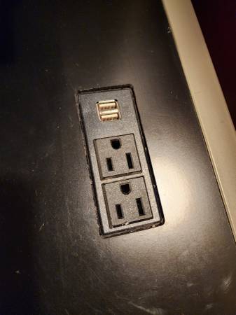 Desk underneath has shelves, a grid for displaying and electrical/USB plugins.