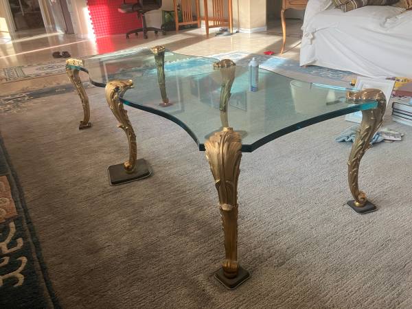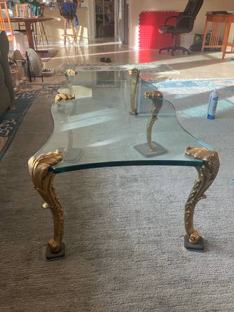Beautiful glass top coffee table with solid brass legs. Glass is 3/4” thick 60” long - 24” wide - 15” tall
