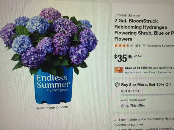 Hydrangea that can range in color from pink to blue, depending on application of garden sulphur. Great starter plant. I have only one of these. Photo #1 is what is being sold. Photo #2 is Home Depot ad of 2 gal size.