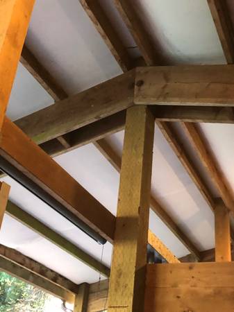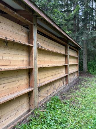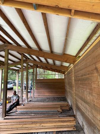 Pole Barn construction with dimensional lumber 6x6 P.T. post, 2x12 double rafters, 2x4 purlins, metal siding and roof all in excellent condition.