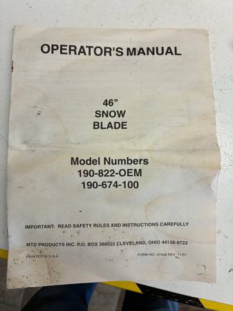 Snow plow blade with attachments. never used has instruction manual. located two minutes from Port Angeles Walmart.