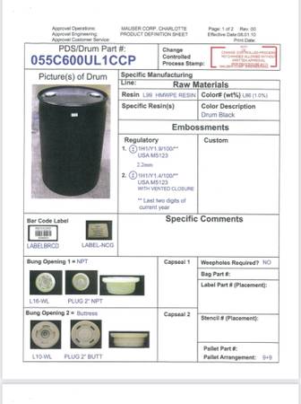 Used Once and thoroughly cleaned. Prior material is non-toxic and very water soluble so no residual material is left in these drums - like new condition. A MSDS is available if needed.