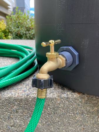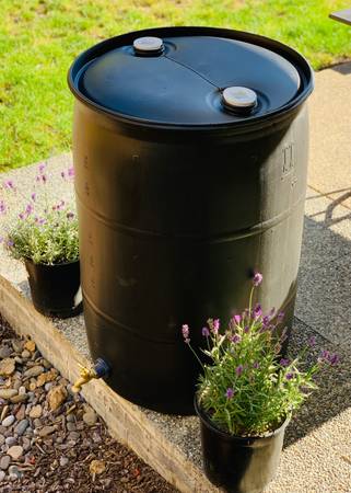 55-gallon water barrel with faucet. Perfect for gardening or emergency water storage. Food Grade plastic. All new hardware. Heavy duty bulkhead fitting and an all lead free metal spigot.