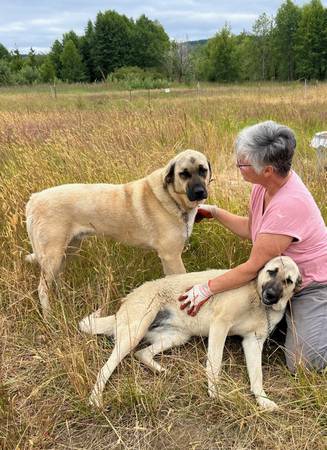 Two-year-old triplets, one male (neutered), two females (spayed). Too much prey drive to be trustworthy livestock guardians, but they are well socialized, completely lovable, and biddable. All have spent some time in the house, but they live primarily outside and keep the coyotes and cougars away. One, two or three available (we are keeping their parents) for $150 each.