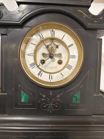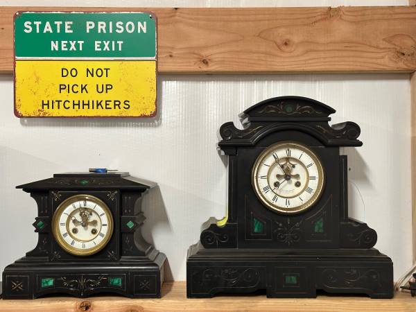 Two slate clocks, James Henderson, two sizes, partial open movement, malachite inlay. Smaller clock is for repair, with loose side piece and inner workings. Unmarked 4.5” dial $100 obo. Larger clock...