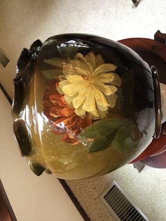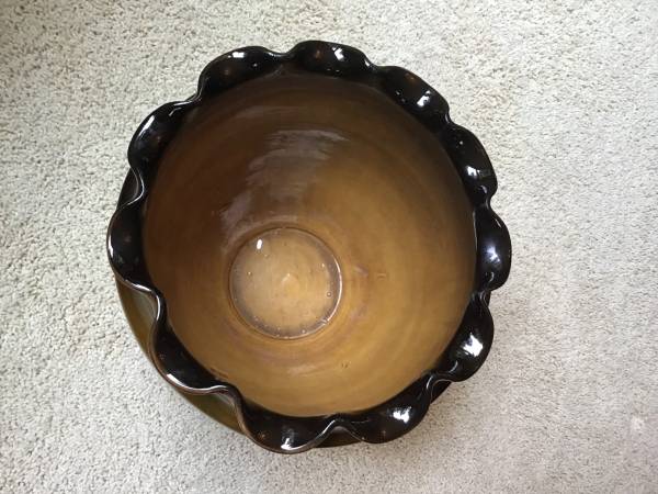 Made at Weller Pottery, Ohio, circa 1905, a very large Louwelsa decorated scalloped rim, jardinière bowl on standard glaze. Bowl opening / diameter 12 1/4 inch, height 9 1/2 inch. Floral design is chrysanthemums.
