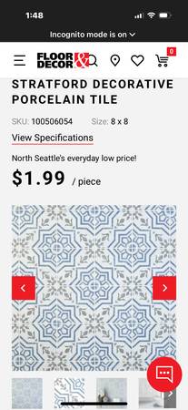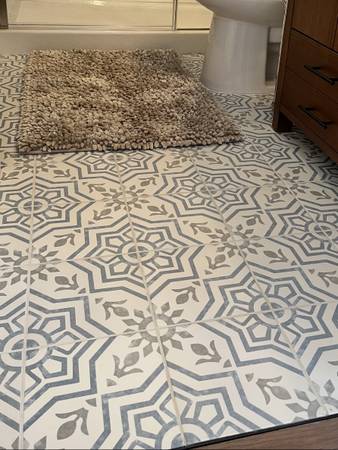 Purchased at Floor and Decor (they still have this tile if you need more) and overbought. Adessi porcelain 8x8 tiles in the Stratford pattern with a matte finish (non-slip!). The pattern is made up of grey shades, white and light blue. I have 4 full boxes for $40 total (each box covers