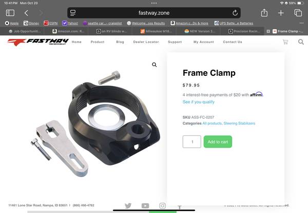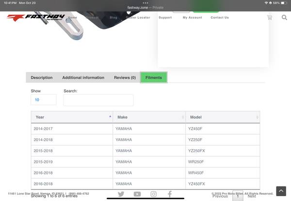 Fastway pro moto billet steering damper kit with all mounting hardware for Yamaha YZ/WR 250/450 with 2 mounts for 2014-2025 see charts in photos for fitment. Comes with Two separate frame mount clamps to fit all years shown in photos. No leaks or issues just went a different route with new bike. Looking for a straight forward no b.s. transaction please. Can ship if needed.