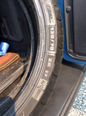 Front Motorcycle Tire 120 / 70 ZR 17 Michelin pilot 4 Maybe 30 miles on tire Off the front of my BMW R 1100 RT Michelin no longer makes a 18” rear tire for This bike:::::: So I had to by a New...
