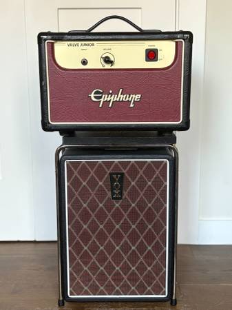 Selling a 5w all tube guitar rig, I playfully call the Evil-Robot. The head is a Epiphone Valve Junior and it has not been modded. The cabinet is a Vox 1x10 Super Beatle Mini even though it's a miss martched set they sound great together.