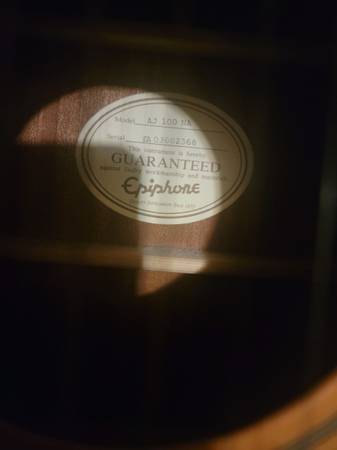 Details from the label: Brand: Epiphone Model: AJ-100 NA (AJ = “Advanced Jumbo”, NA = Natural finish) Serial: EA03082368 Label text: “This instrument is hereby GUARANTEED against faulty workmanship...