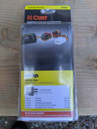 New in the box CURT Subaru 4 pin trailer hitch harness. No splicing required. Supports the following Subaru models: Ascent 2019-20 Forester 2009-2020 Outback (except sport) 2010-2020 XV Crosstreck...