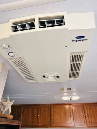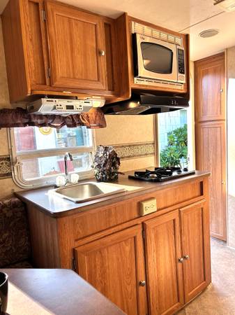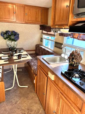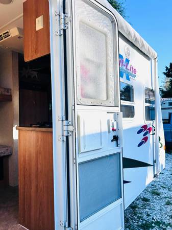 This is a wonderful tiny 2008 16' travel trailer, including hitch (14' Body) R-Vision Trail-Lite Crossover travel trailer. Everything works! Nice awning. Sleeps 4. The dining area makes into a large bed. And there are two bunks. A toilet shower combo. An exterior shower. A kitchen that has everything you need. The refrigerator can run off electric or propane. There is air conditioning. There is also a stereo that plays inside and outside! Lights work great, excellent condition, clean. Clean title. Good newer tires. Extras included. Lots of cabinets in this little RV. Super lightweight trailer! Propane tanks are full. It could use a new battery. Can deliver. The ball size is 2 5/16.