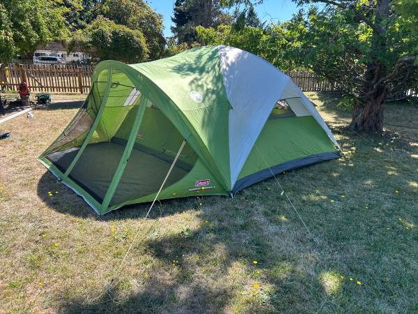 Very good condition Coleman tent with screen porch (one of the best features). Interior height of 6 ft for comfortable changing/moving inside. This is defiantly a family size tent to comfortable sleep 5 to 6 people (you dog can sleep on the porch). No tears, rips or worn spots. See link below for Coleman's description. Easy two-person set-up but I have done it solo a couple times.