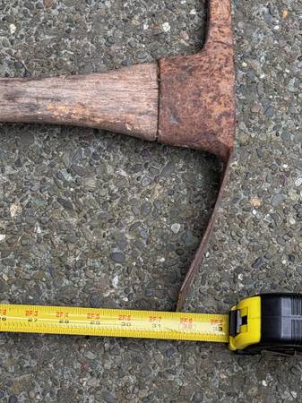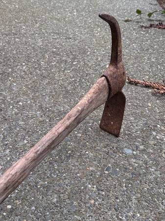 Early vintage pick axe, useful for tilling soil or other similar projects or good for display just as is. Has a pick at one end of the head for breaking or prying, and an adze for digging and cutting into the ground. Long handle 33 inches. Head needs some tightening it is 14 inches.