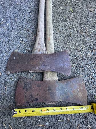 Great old logging antique axes, for display or restoration. Both were made in the USA by Kelly and are signed True Temper Flint Edge. Perfect for a NW feel in a display on the wall or ideal for someone who likes to restore these old axe heads and create new handles for them.