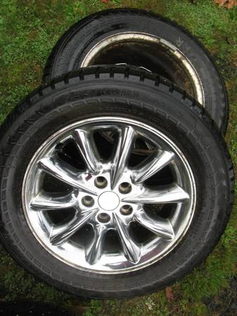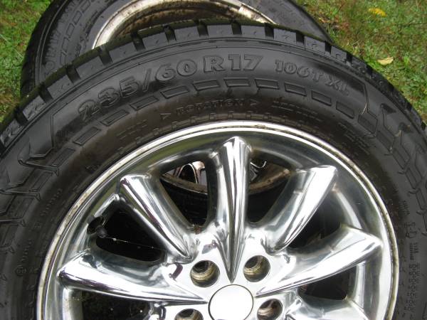 A good set of Tires mounted on alloy wheels and ready to put on the vehicle. Includes 4 Chrome Alloy Wheels and 4 Studded tires for Cadillac or SUV 17" NICE! See all pictures what you see is what you get, Lightly used only 1 season! Was original cost of $2,000, Plus studding. A super deal. Ready to mount on your car and go! See information on tires in the photos or text, will work with any serious buyer, You Haul, cash only. show contact info